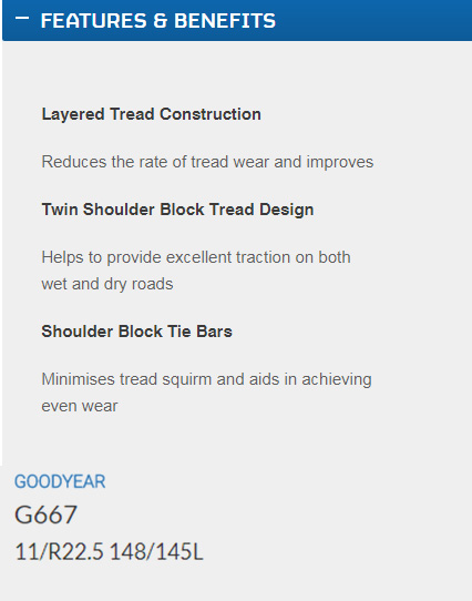 The G667 is Goodyear’s long standing proven drive tyre. It is known for high mileage and reliable traction on highways and paved roads.