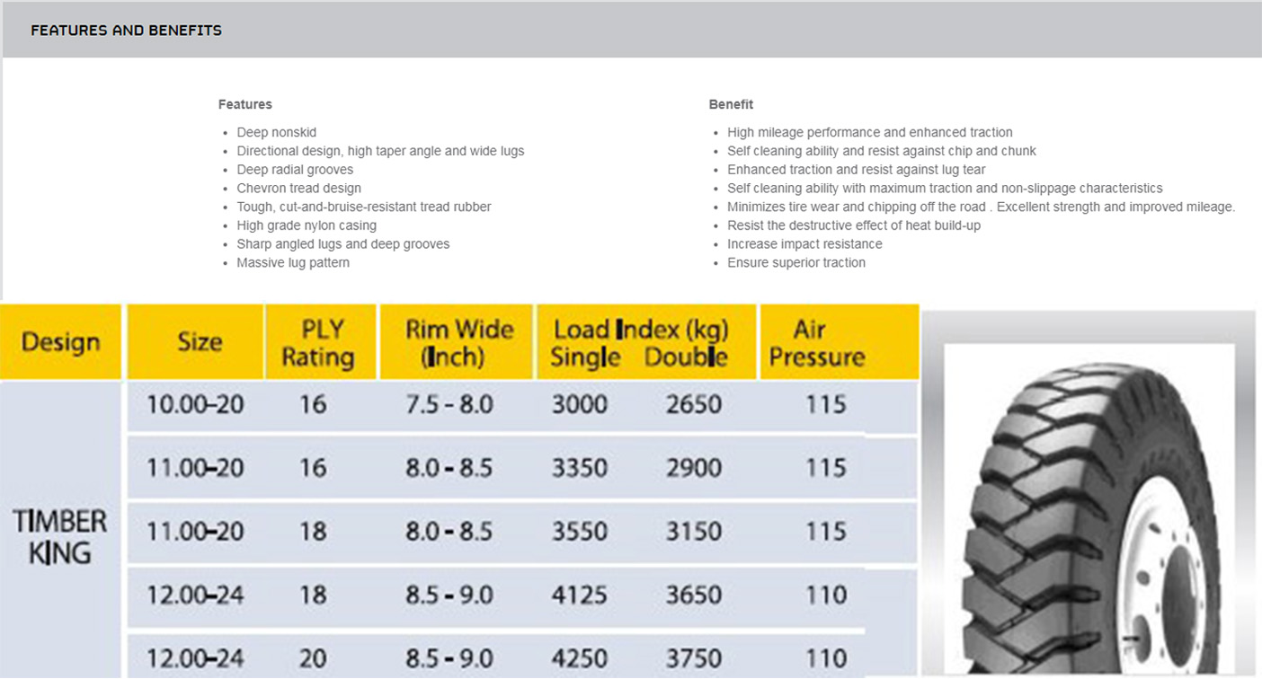 When it comes to logging and heavy hauling situations, this tire is the undisputed champion. With its casing of high grade nylon, Timber King resist the destructive effect of heat and heat buildup.Its combination of tough,cut resisting rubbers minimize wear on the road and chipping off the road. All of which makes it superbly durable and easily retreadable.