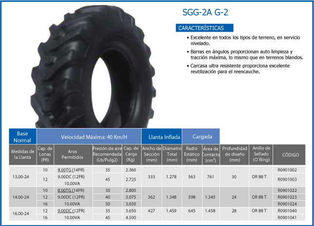 Outstanding, time-tested traction bias tire for use on motor graders in city and county maintenance work, construction and mine applications. The most widely retreaded tire in the industry, the SGG-2A Grader is an outstanding traction bias tire that's stood the test of time. Ideal for use on motor graders in city and county maintenance work, construction and mine applications, the tire features precision angled bars for longer wear and maximum traction in soft soil.