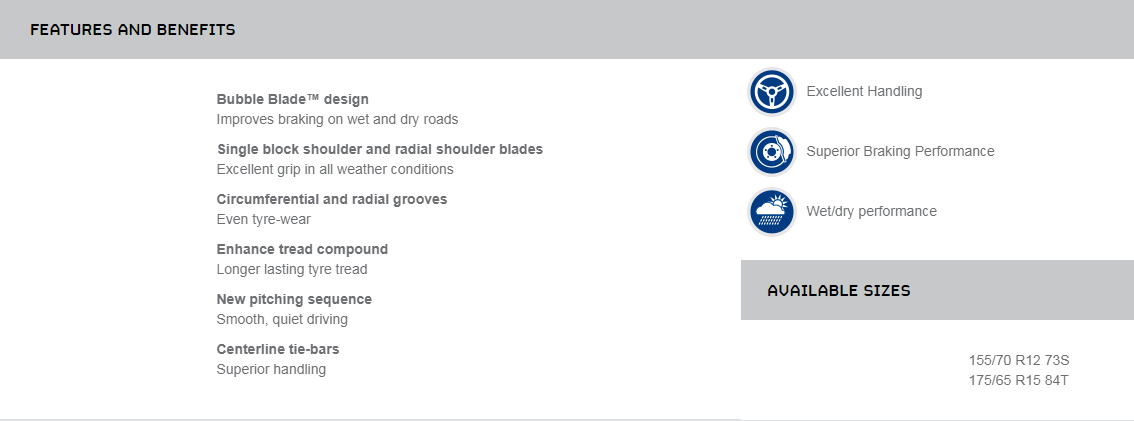 The GT3 is about comfort. And value. But most importantly, the GT3 is about giving you the safest tyres we know how to build. Its innovative Bubble Blade™ tread block design works equally well in wet or dry conditions, while tie-bars enhance the car's handling in just about any situation. This radial tyre is for the driver whose priorities match our priorities- safety, comfort and peace of mind.