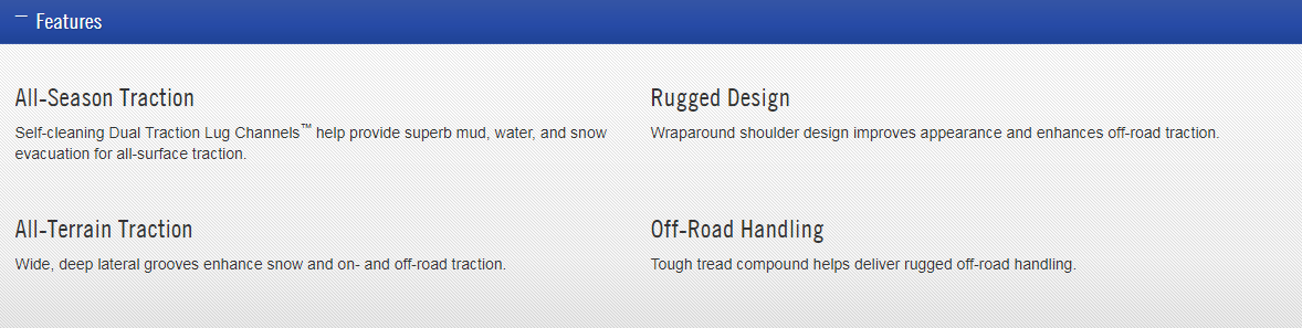 Self-cleaning Dual Traction Lug Channels™ help provide superb mud, water, and snow evacuation for all-surface traction.