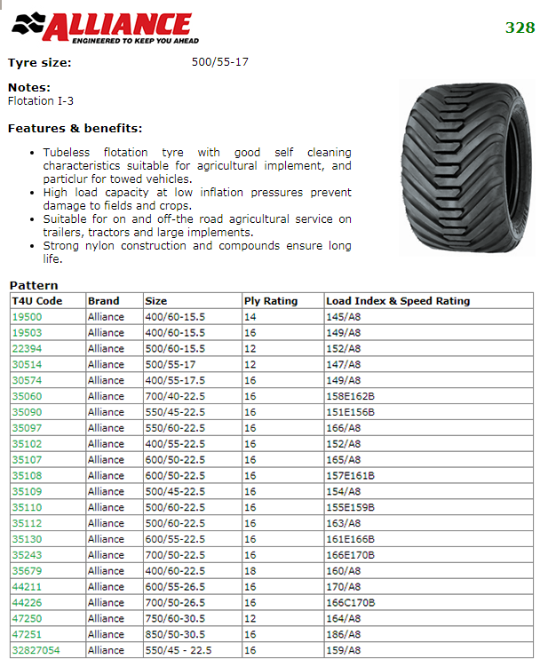 Alliance 328 Flotation tire is a specially designed tire constructed to carry heavy loads and is used in harsh conditions. It provides improved stability over dual-tire configuration. The tire also provides much better ride comfort, higher machine mobility, better self cleaning and better overall performances on road. 328 comes in Steel Belted, Fabric and Heavy Duty variants for different sizes. Apart from its standard applications in trailers, forestry trailers and forest harvesters, the special HD tire is also developed for agricultural baler applications.