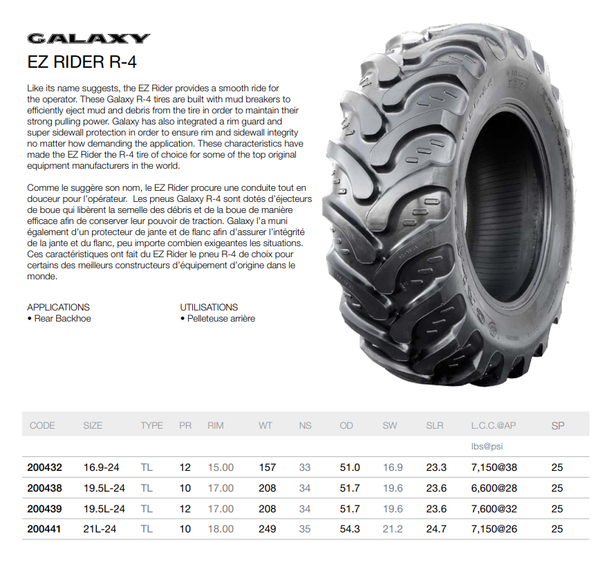 The EZ Rider Agro-Industrial tire, derives its name from the smooth ride it provides thanks to its rounded tread bars that reduce tire skip and vibration. These Galaxy R-4 tires are built with mud breakers to efficiently eject mud and debris from the tire in order to maintain its strong pulling power. Galaxy has also integrated a rim guard and its Super Sidewall protection to ensure rim and sidewall integrity no matter how demanding the application. These characteristics have made the EZ Rider the R-4 tire of choice for some of the top original equipment manufacturers in the world.