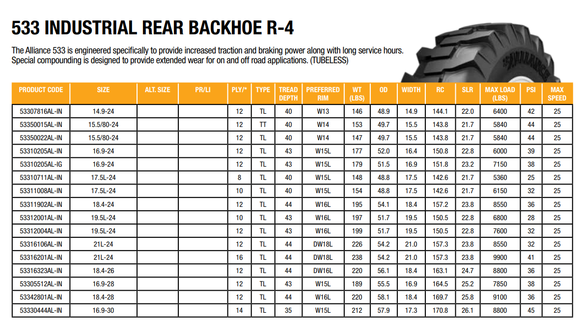 Alliance 533 is an industrial drive wheel tire. The tire’s heavy nylon construction is designed to achieve best results on industrial use as well as off road and building site services. Its tread design gives more traction and braking power as well as high mileage on road.This pattern can be used for some of the Agriculture applications also.