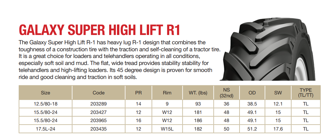 Galaxy Super High Lift R-1 is especially designed for telescopic handlers used in agriculture. It is also suitable for backhoes when extra traction is needed in soft soil. The flat, wide tread provides stability for telehandlers and high-lifting loaders. Its 45 degree lug design provides a smooth ride on hard surfaces